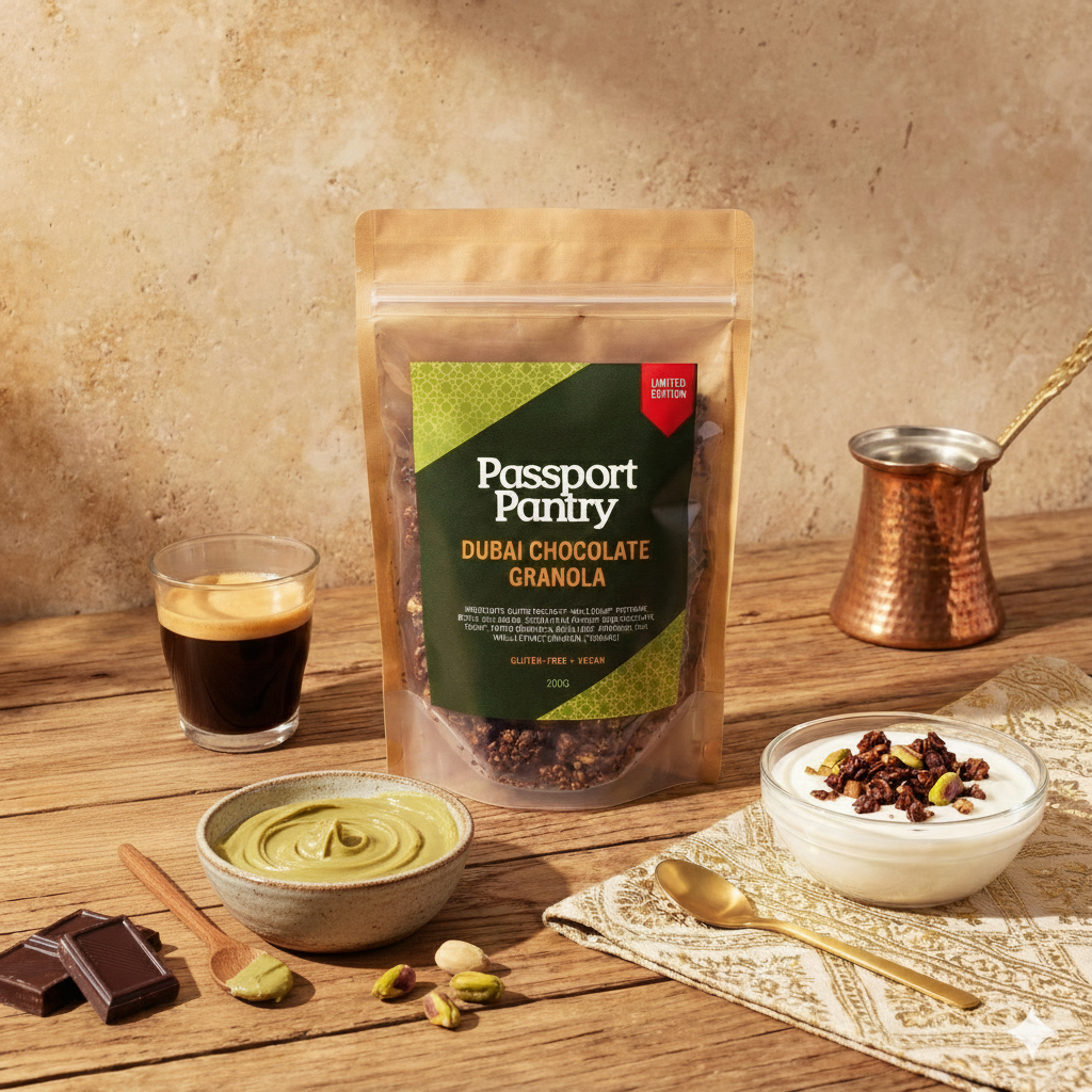 Inspired by the lavish dessert culture of Dubai — where dates, pistachio, and dark chocolate rule the table — this blend reimagines indulgence with modern restraint. We took the bold richness of Middle Eastern chocolate desserts, layered in creamy pistachio butter, coconut milk, and a hint of sea salt for balance. It’s where old-world luxury meets new-age wellness.