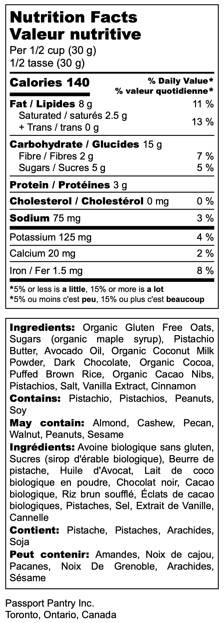 Organic Gluten Free Oats, Sugars (Organic Maple Syrup), Pistachio Butter, Avocado Oil, Organic Coconut Milk Powder, Dark Chocolate, Organic Cocoa, Puffed Brown Rice, Organic Cacao Nibs, Pistachios, Salt, Vanilla Extract, Cinnamon